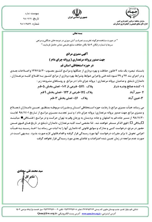 جهت صدور پروانه مرتعداری(پروانه چرای مراتع)در حوزه ی استحفاظی قم