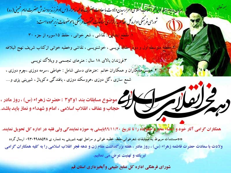 به مناسبت دهه ی فجر انقلاب اسلامی و فرارسیدن ولادت با سعادت حضرت فاطمه ی زهرا(س) و فرزند برومندش حضرت امام خمینی(ره) و هفته ی بزرگداشت مقام زن و مادر مسابقات فرهنگی-هنری ویژه ی دختران و مادران برگزار می گردد.