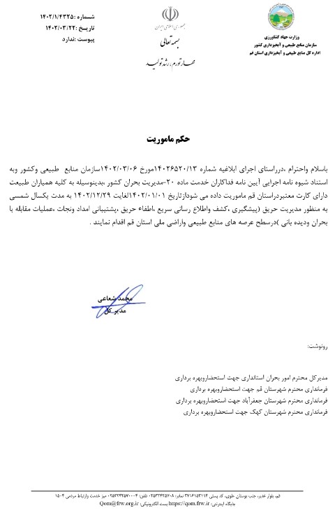 رئیس اداره آموزش، ترویج و مشارکت های مردمی اداره کل منابع طبیعی و آبخیزداری استان قم در ادامه با اشاره به صدور حکم ماموریت به نام اشخاص و همیاران طبیعت حاضر در عرصه های منابع طبیعی گفت: حکم ماموریت حریق در موضوعات پیشگیری، کشف و اطلاع رسانی، اطفا حریق، پشتیبانی امداد و نجات، عملیات مقابله با بحران و دیده بانی در سطح عرصه های منابع طبیعی و اراضی ملی استان صادر و رونوشت احکام مذکور به مدیریت بحران استان و فرمانداری ها ارسال می گردد.